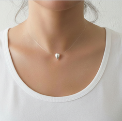 The Illusionist Necklace features a freshwater teardrop shaped pearl suspended by a transparent filament, creating a striking optical illusion that appears to defy gravity.